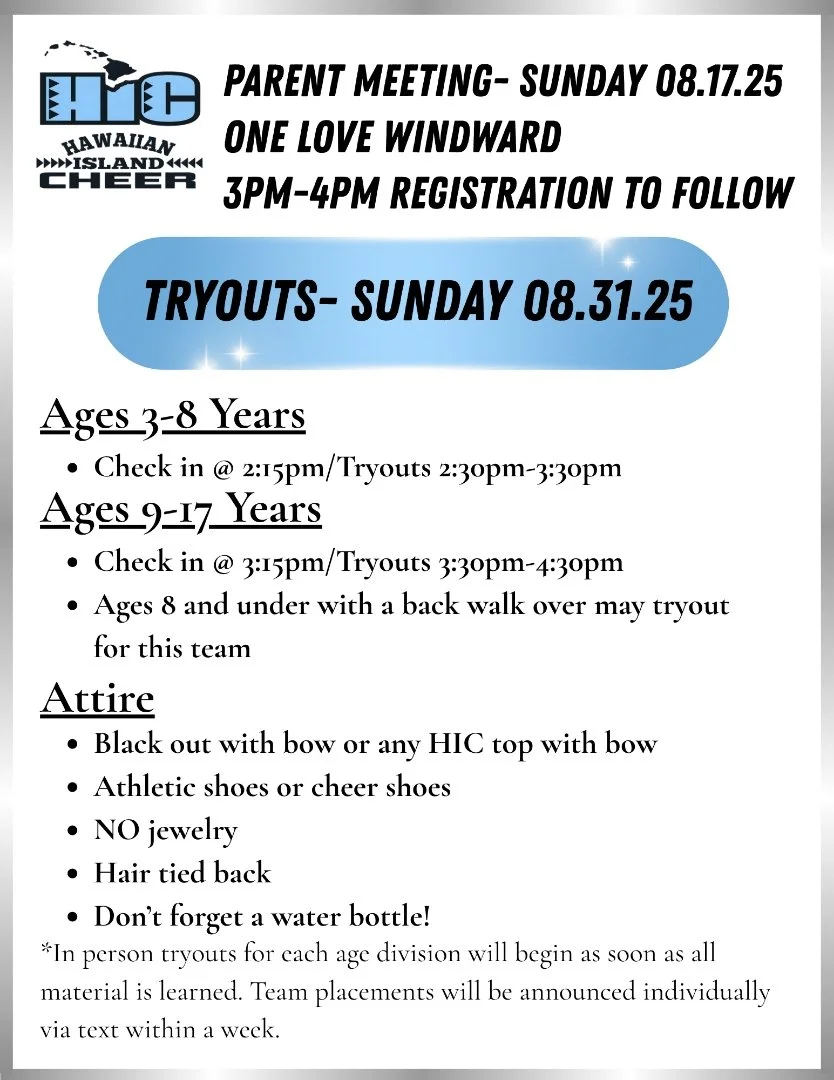 Come try out for Hawaiian Island Cheer! We welcome athletes from 3 years old to 19 years old!